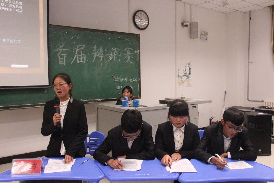 随后,进行了第二场比赛。由二号参赛队伍对战三号参赛队伍,围绕“电子书能代替传统的纸质书吗”展开辩论。正方二号参赛队伍观点是“电子书能替代传统的纸质书”,反方三号参赛队伍观点是“电子书不能代替传统的纸质书”。在开篇立论阶段中,正方一辩辩手吕亚丽临危不乱,逻辑清晰,获得了员工会主席郭含的肯定。比赛如火如荼地进行着,观众们的掌声此起彼伏。第二场比赛以正方全票结束。