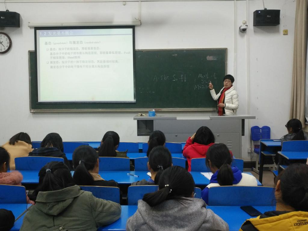 紧接着周金凤博士为我们讲解了自己的主攻课题——“BODIPY 近红外光敏剂研究进展”。周金凤博士从最简单的近红外光敏简介开始,为同学们列举了生活中发光物体的例子,极大的激发了同学们的求知欲望。而后,周金凤博士介绍了光敏研究的发展历程和实际应用,在报告最后周金凤博士贴心的提醒同学们日常生活中多吃蔬菜,保证身体健康,学好专业知识。学术报告在同学们的掌声中圆满结束。
