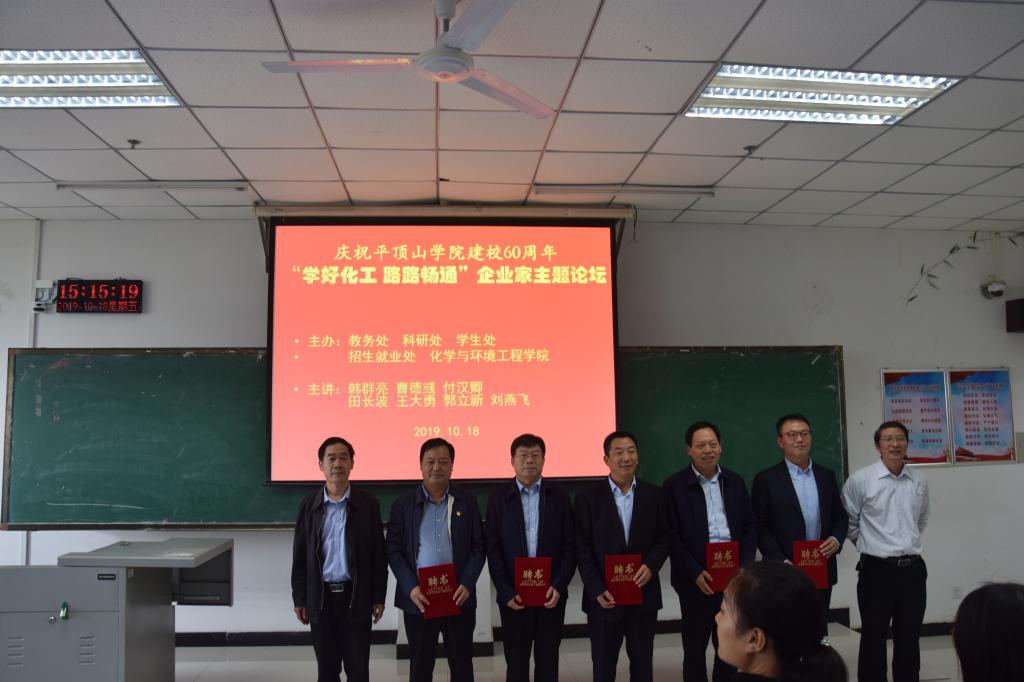 活动开始前,中国平煤神马集团焦化事业部部长、中国平煤神马平顶山朝川焦化有限公司党委书记、94级员工韩群亮,中国平煤神马集团首山化工有限公司党委书记、董事长、90级员工曹德彧,河南神马氯碱化工股份有限公司总经理、89级员工付汉卿,中国平煤神马集团汝州电化有限公司董事长、89级员工田长波,河南平煤神马远东化工有限公司总经理、93级员工王大勇应学校之邀,受聘为公司行业教师。
