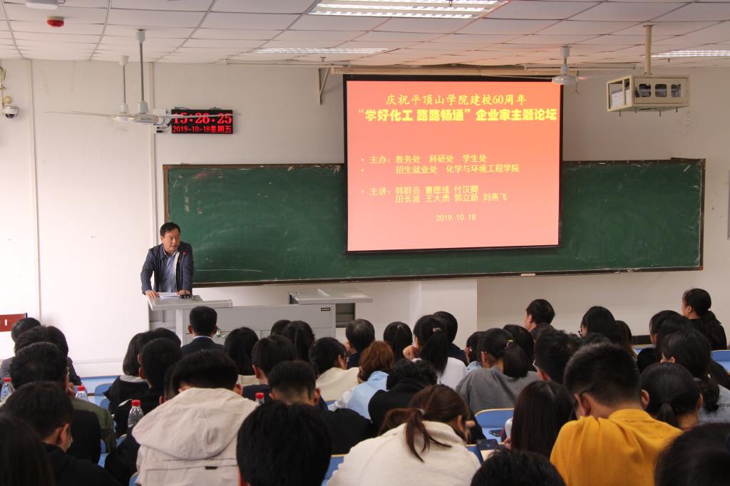 主题论坛上,五位员工分别以《中国平煤神马集团产业布局与发展前景》《方兴未艾的中国尼龙城建设》《转型升级中的煤化工产业》《中国岩盐之都盐化工产业发展概览》《化工人的心路历程》为题,为在场师生介绍了国内特别是平顶山周边地区尼龙化工、煤化工、盐化工产业结构现状及发展前景,分享了人生奋斗的感受及成功经验,使员工增进了专业认知,了解了就业前景,明确了学习方向。此外,宜昌半山酒店管理有限公司总经理、97级员工刘燕飞,中船重工710研究所高级工程师、97级员工郭立新也给同学们分享了他们不畏艰难、敢于打拼的生动故事,使同学们领略了他们永不退缩、勇攀新高的进取精神,增强了学好专业知识、书写精彩人生的信心和勇气。